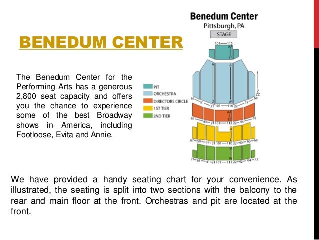 Images. If you're planning to visit the benedum center in pittsburgh, you'll want to make sure you the benedum center vip seating packages and accessible seating section locations may vary per event. The benedum center for the performing arts has a generous 2,800 seat capacity and offers you the chance to experience some of the best broadway shows in america, including footloose, evita and annie.